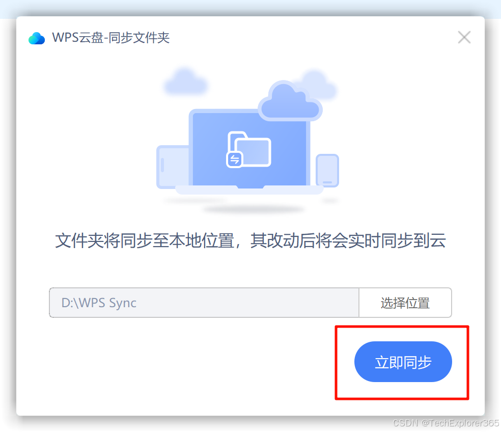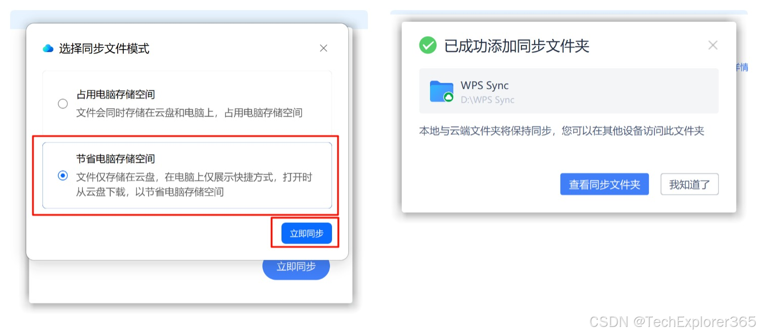 在「选择同步文件模式」中,选择「节省电脑存储空间」并点击立即同步,完成设置