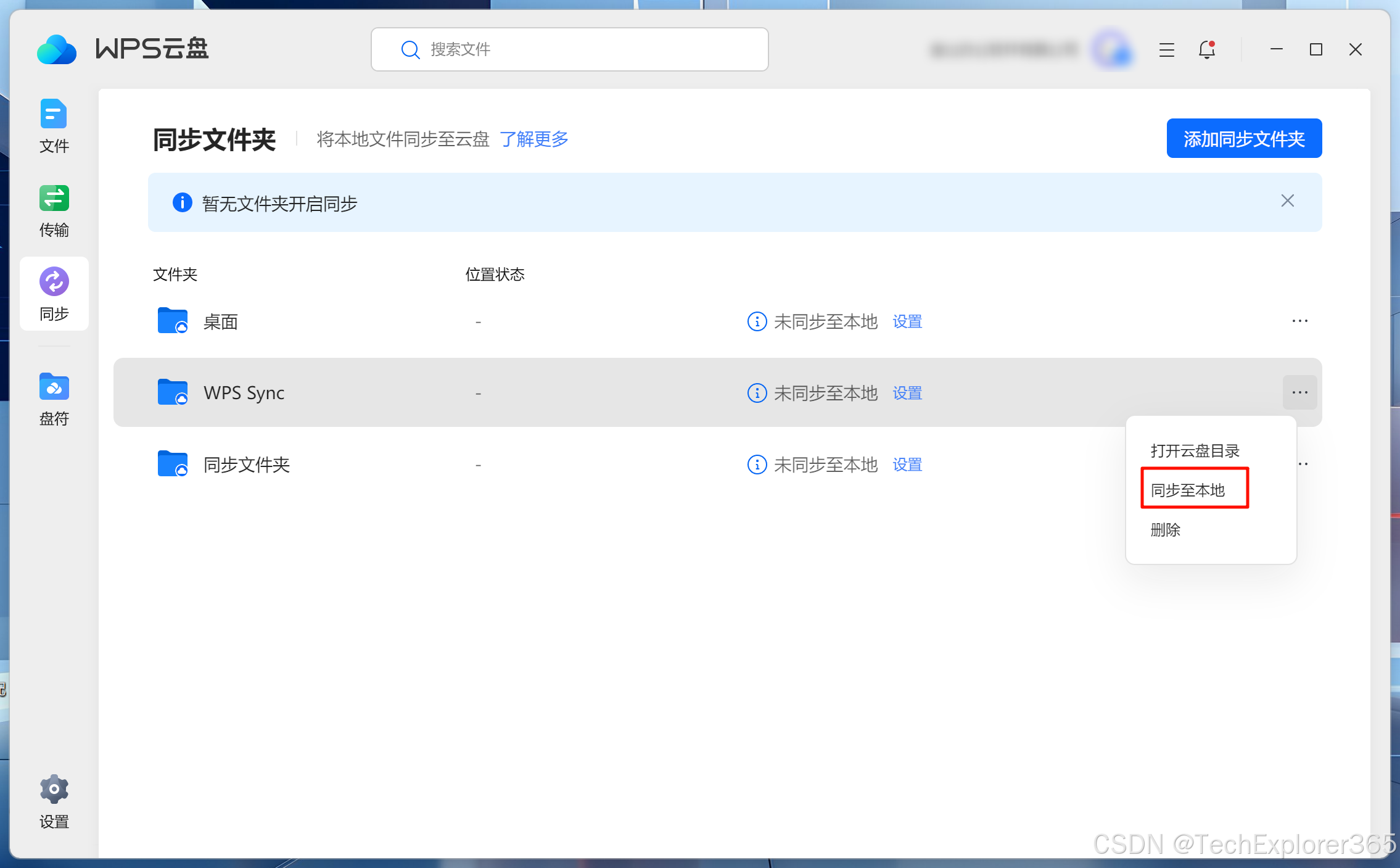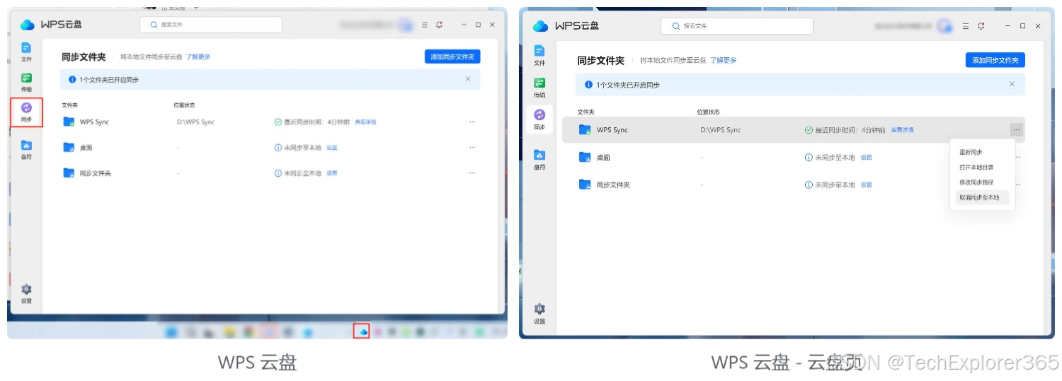 点击右下角托盘图标,点击「同步」,打开同步文件夹页面,选择需要更改同步模式的文件夹,点击「取消同步到本地」