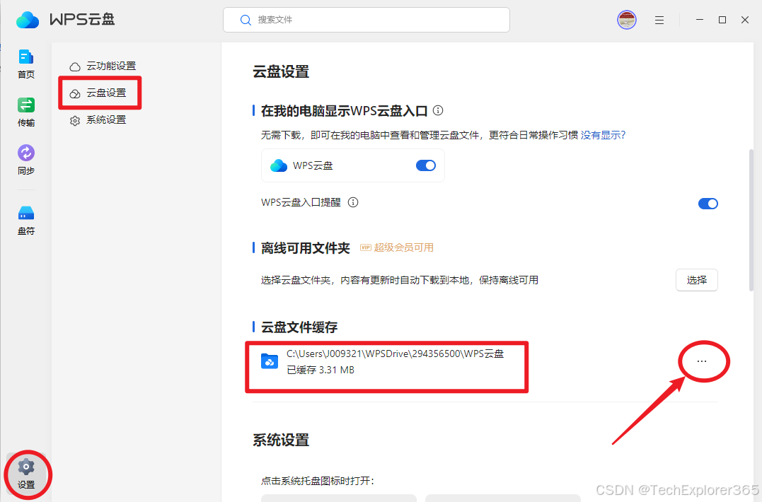 进入WPS云盘,先点击左下角设置选项,接着点击左侧云盘设置,进入云盘设置,找到「云盘文件缓存」项,点击右侧