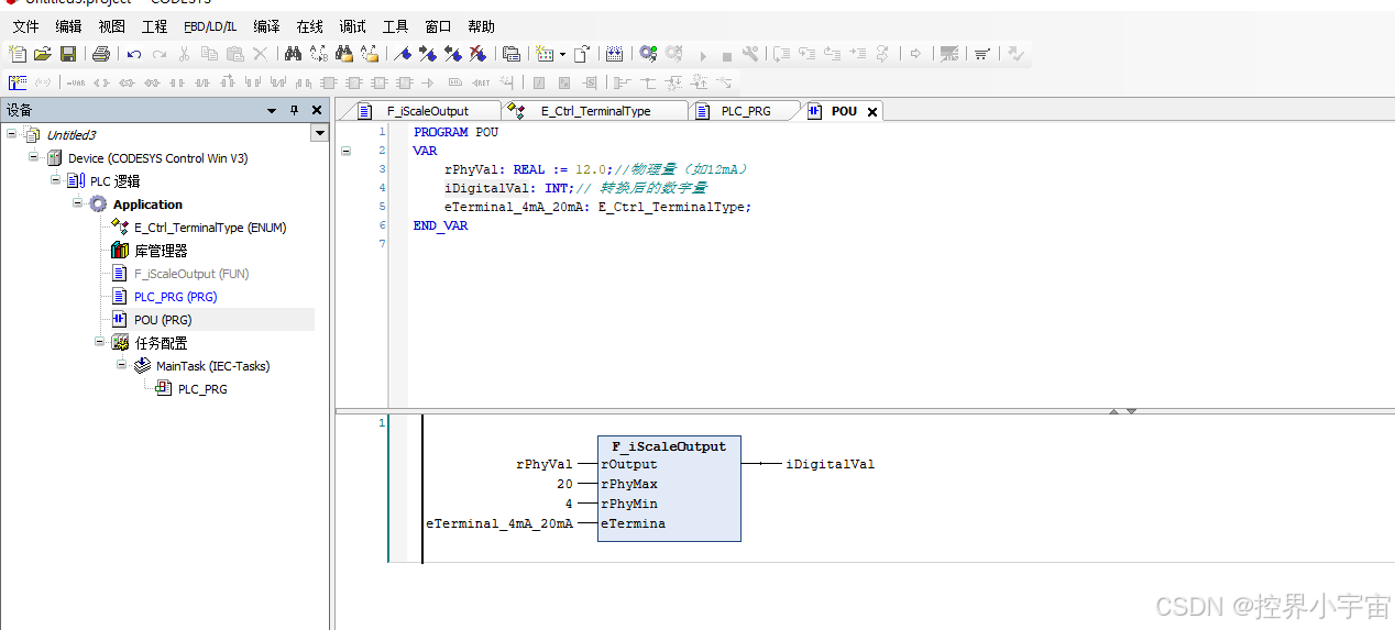 下面结合实际场景,自定义一个"模拟量转数字量"函数(F_iScaleOutput),实现0~20mA、4~20mA等模拟量信号到INT类型数字量的转换,步骤如下: