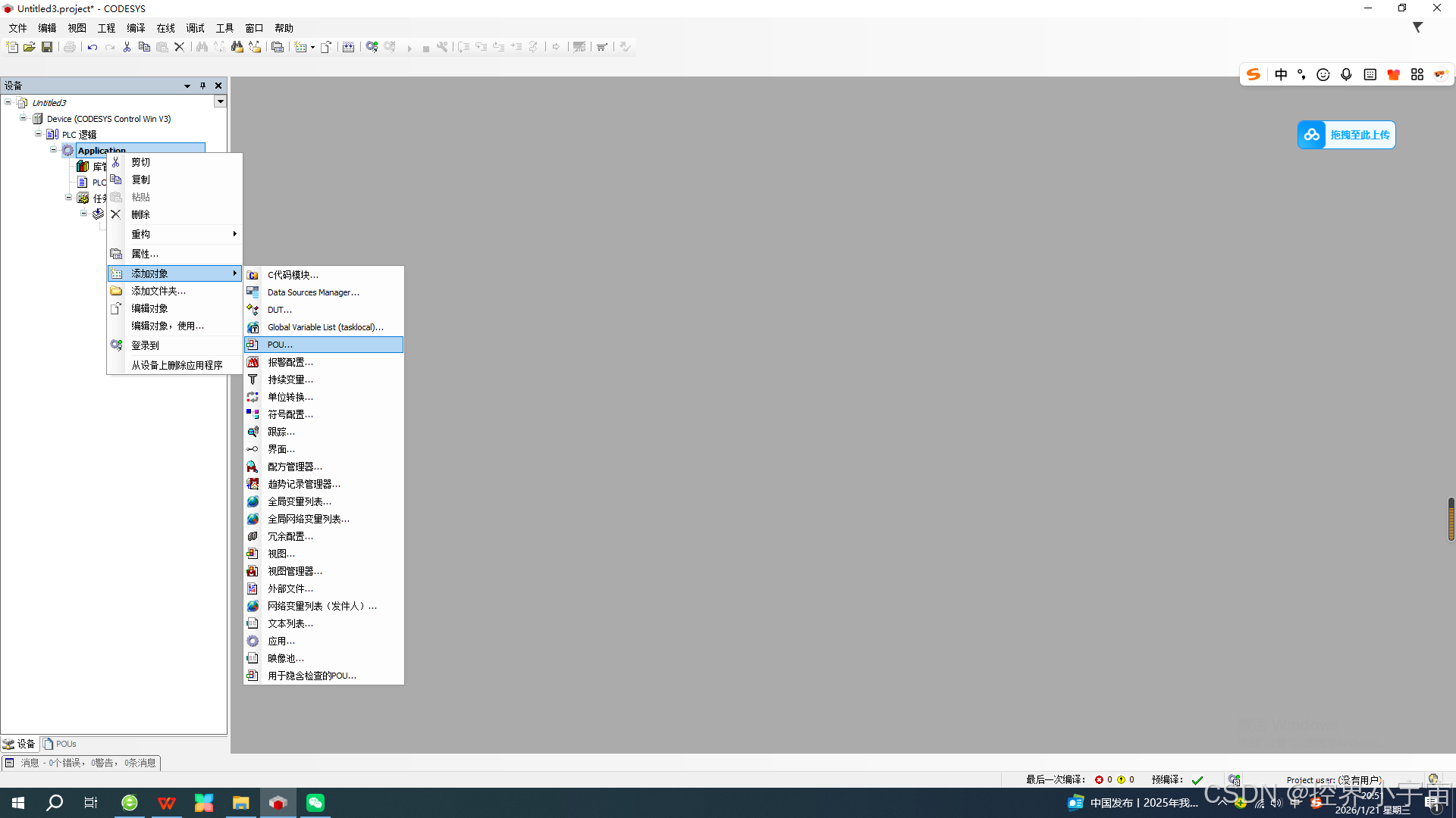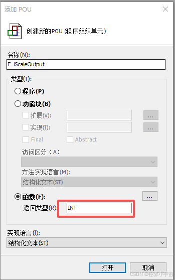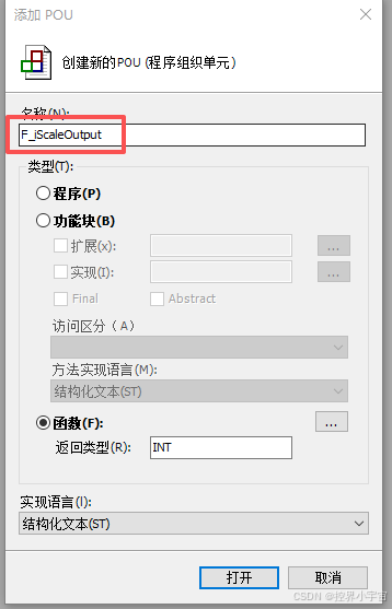 - 右键项目→"添加对象"→"程序组织单元",选择"函数",编程语言设为ST,名称设为"F_iScaleOutput",点击确定;