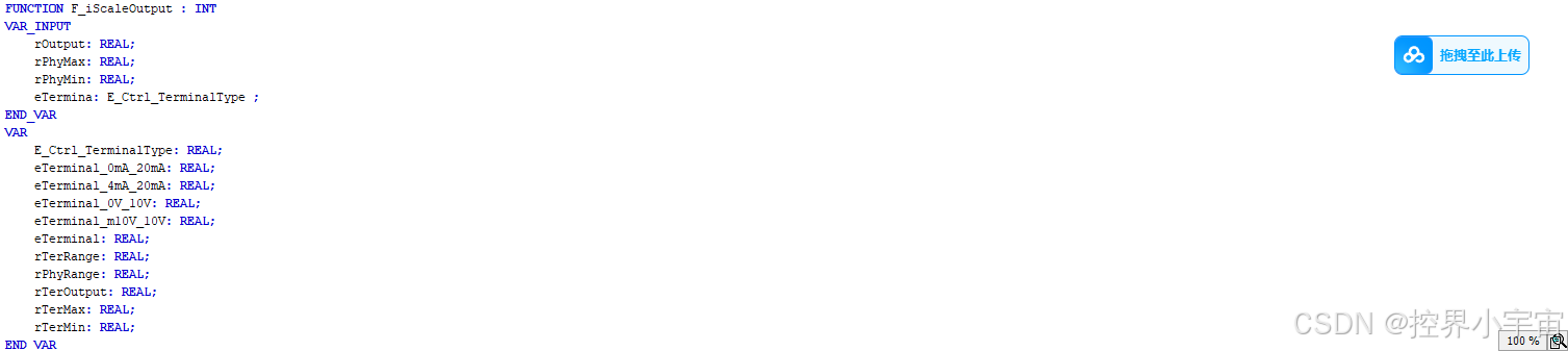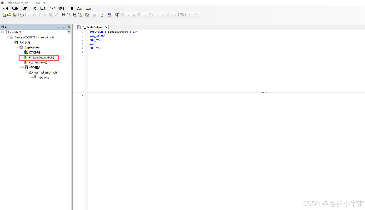- 双击函数进入编辑界面,先定义返回值类型:函数名即返回值,在函数声明行修改类型为INT(默认可能为BOOL),即"FUNCTION F_iScaleOutput : INT"。
