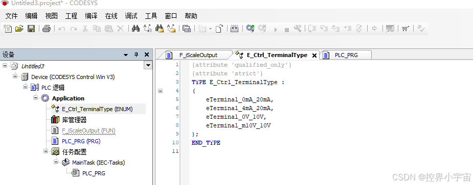 注:E_Ctrl_TerminalType为枚举类型,需提前自定义,包含模拟量类型(0~20mA、4~20mA、0~10V、-10~10V),代码如下: