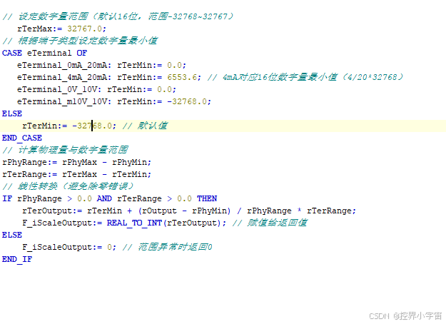通过条件判断区分端子类型,计算数字量转换值,核心逻辑为"线性缩放",代码如下: