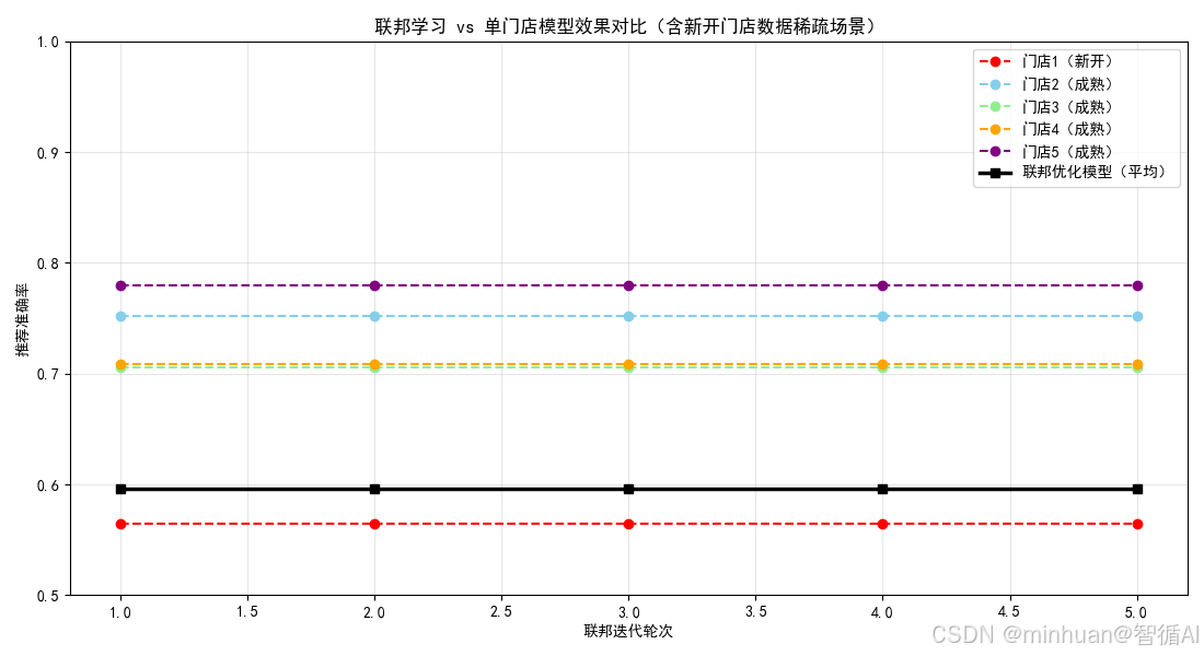 - 直观展示优势:通过折线图对比联邦模型与各门店本地模型的准确率变化,验证联邦学习能否有效打破数据孤岛。