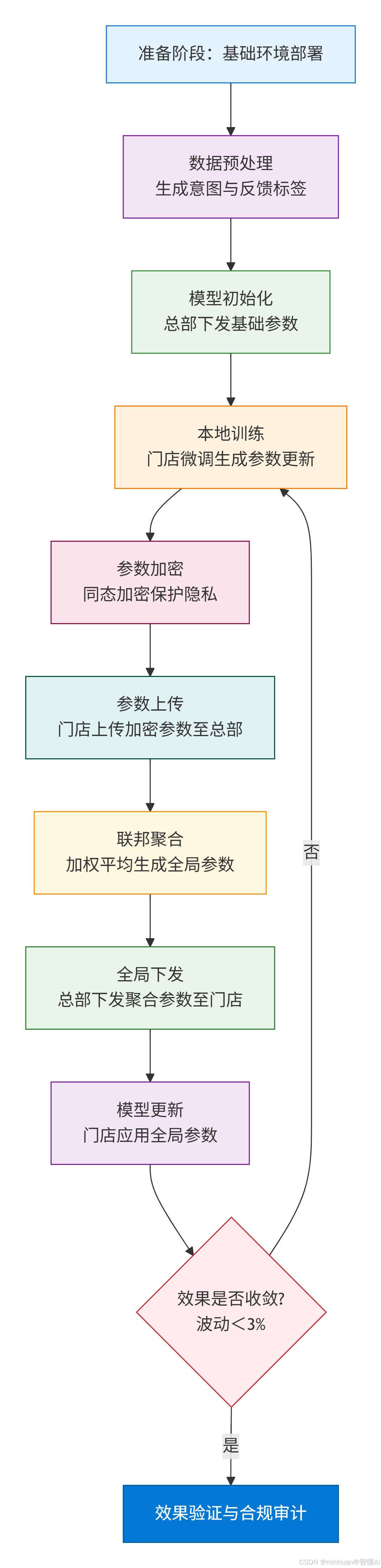 - 模型更新:各门店使用全局参数更新本地模型,完成一轮联合优化,重复"本地训练-参数加密上传-聚合下发"流程,直至推荐准确率波动小于3%,模型效果收敛。
