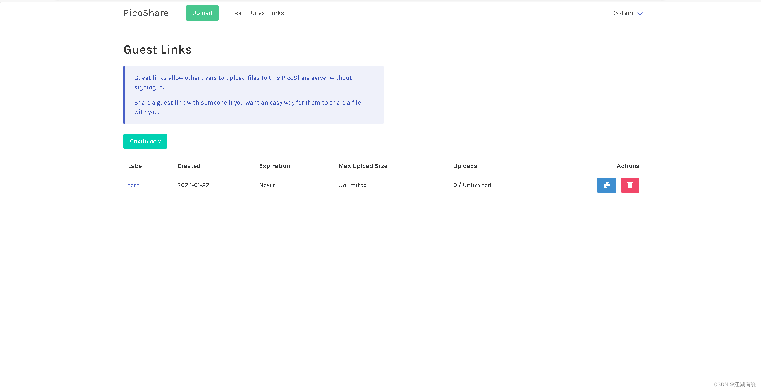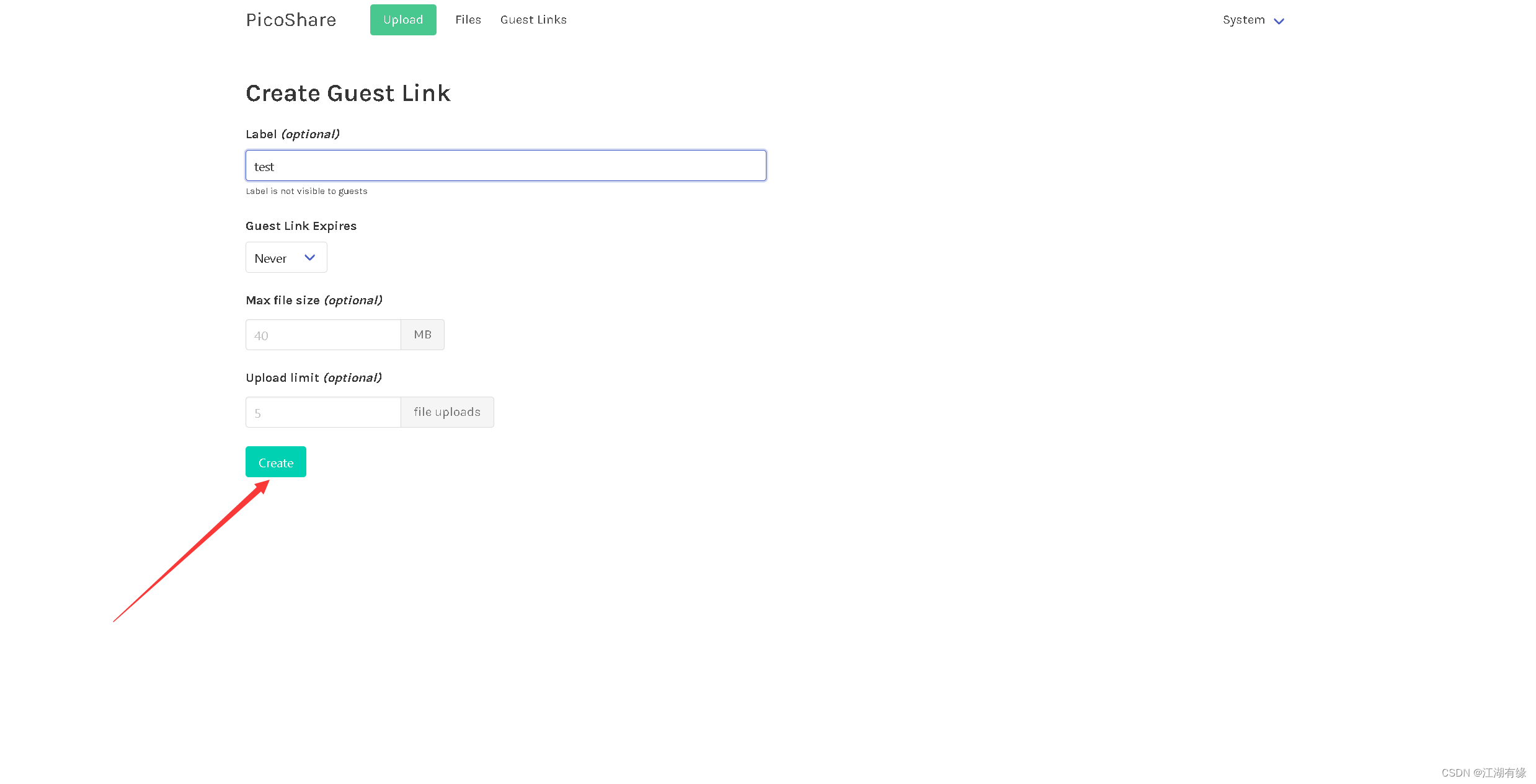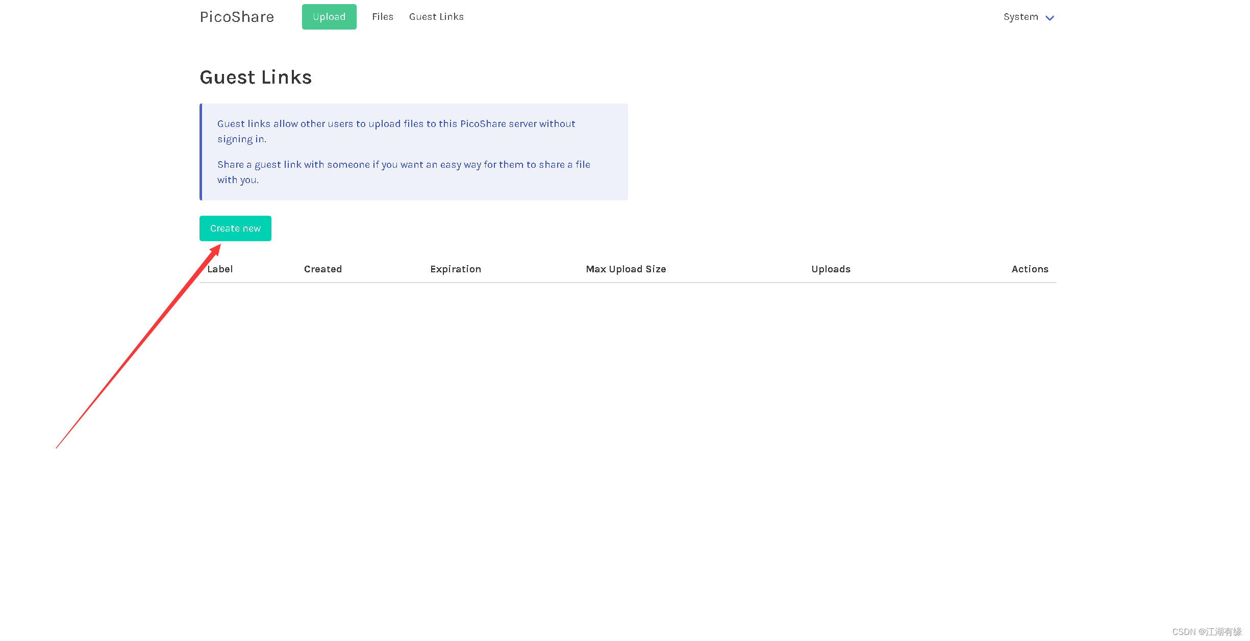 选择"Guest Links"模块,访客链接允许其他用户将文件上传到此 PicoShare 服务器无需登录。如果想让某人轻松找到一种方式,通过访客链接来共享文件。
