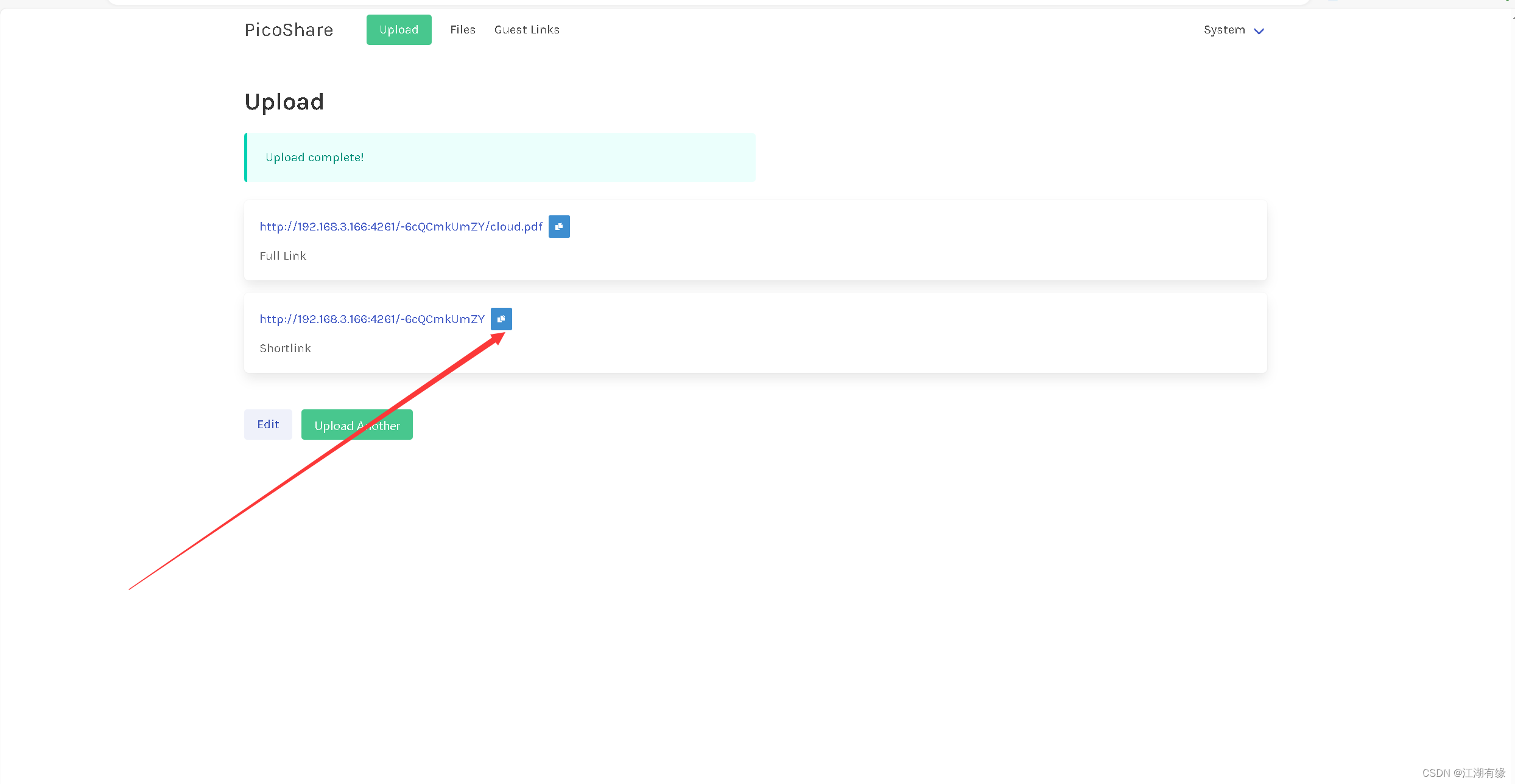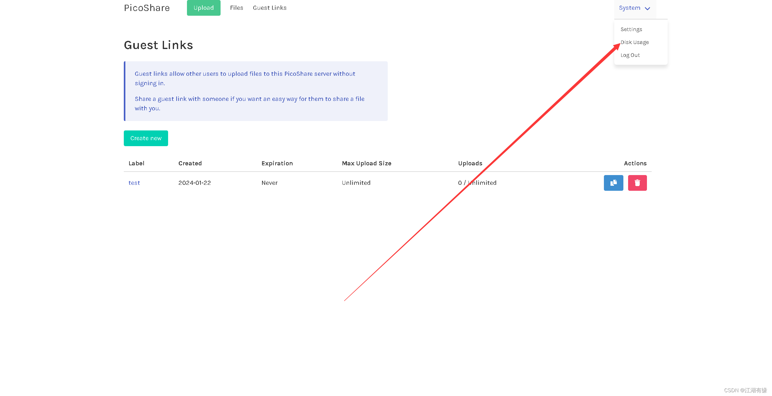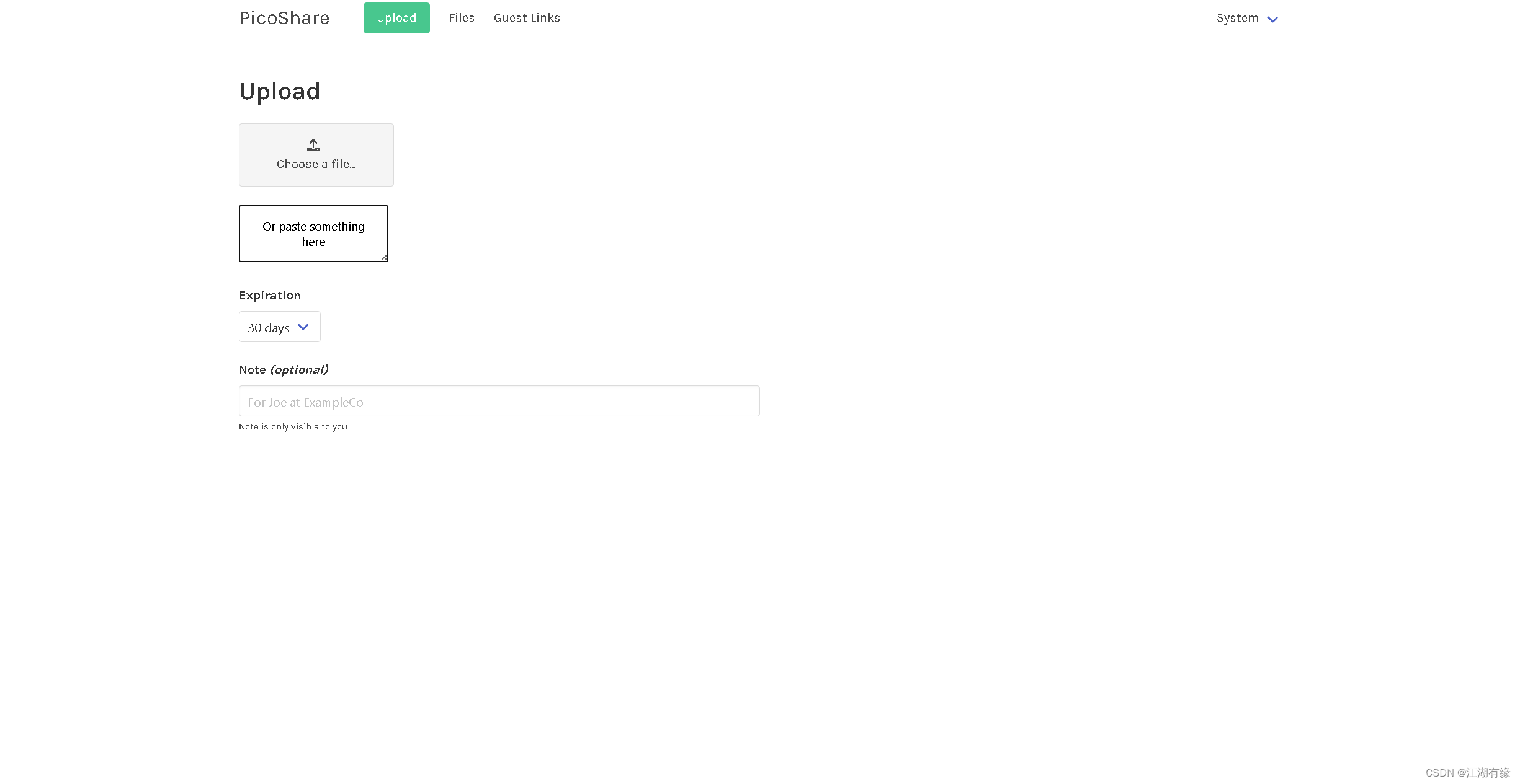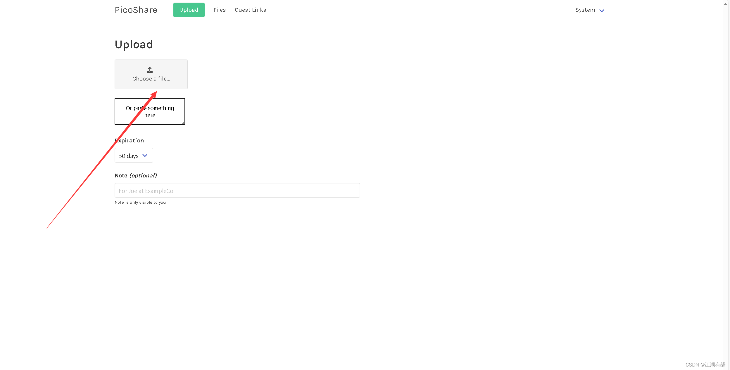 选择"Guest Links"模块,访客链接允许其他用户将文件上传到此 PicoShare 服务器无需登录。如果想让某人轻松找到一种方式,通过访客链接来共享文件。