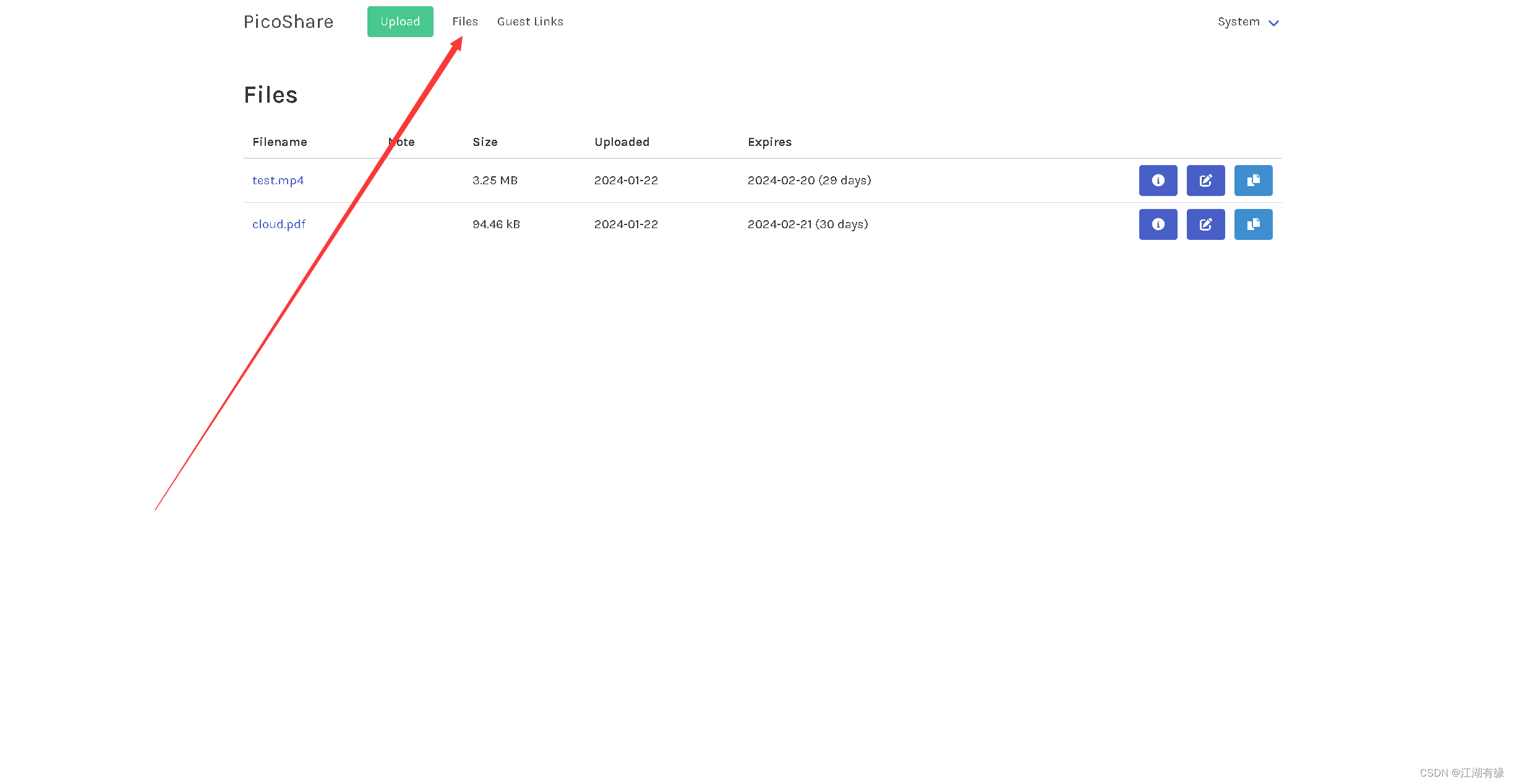 点击上方的"Files"模块,可以看到所有上传的文件列表。