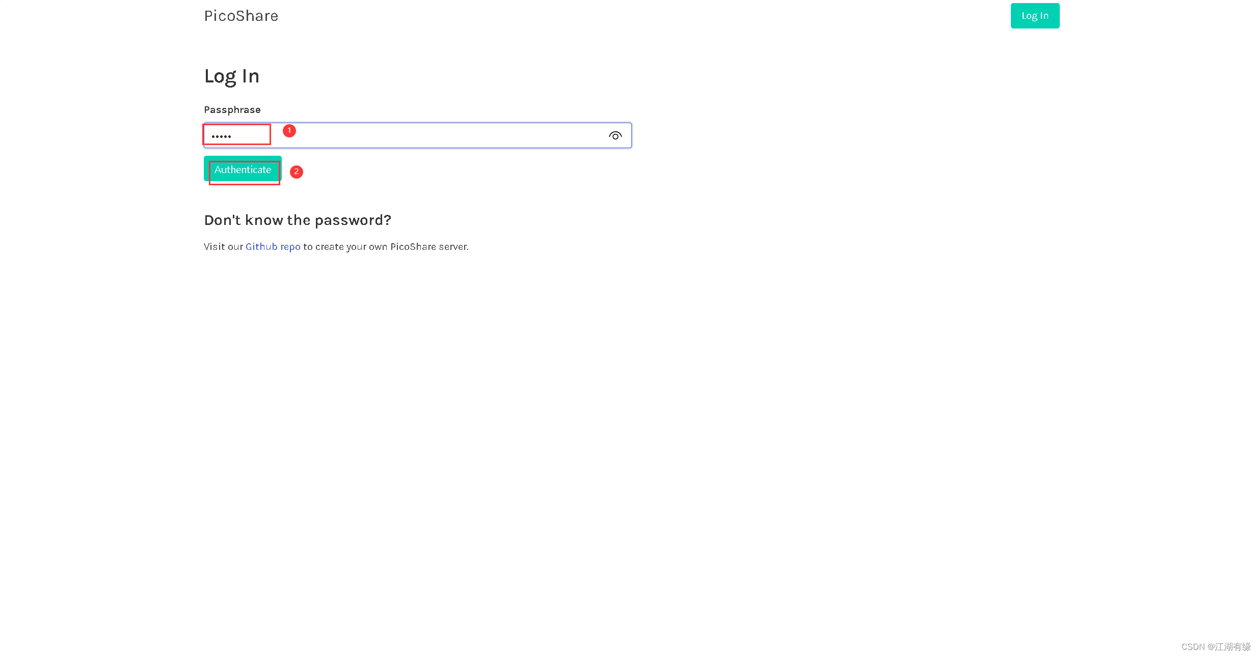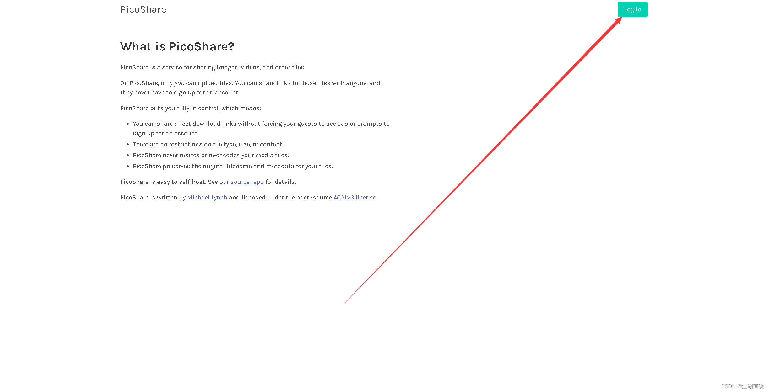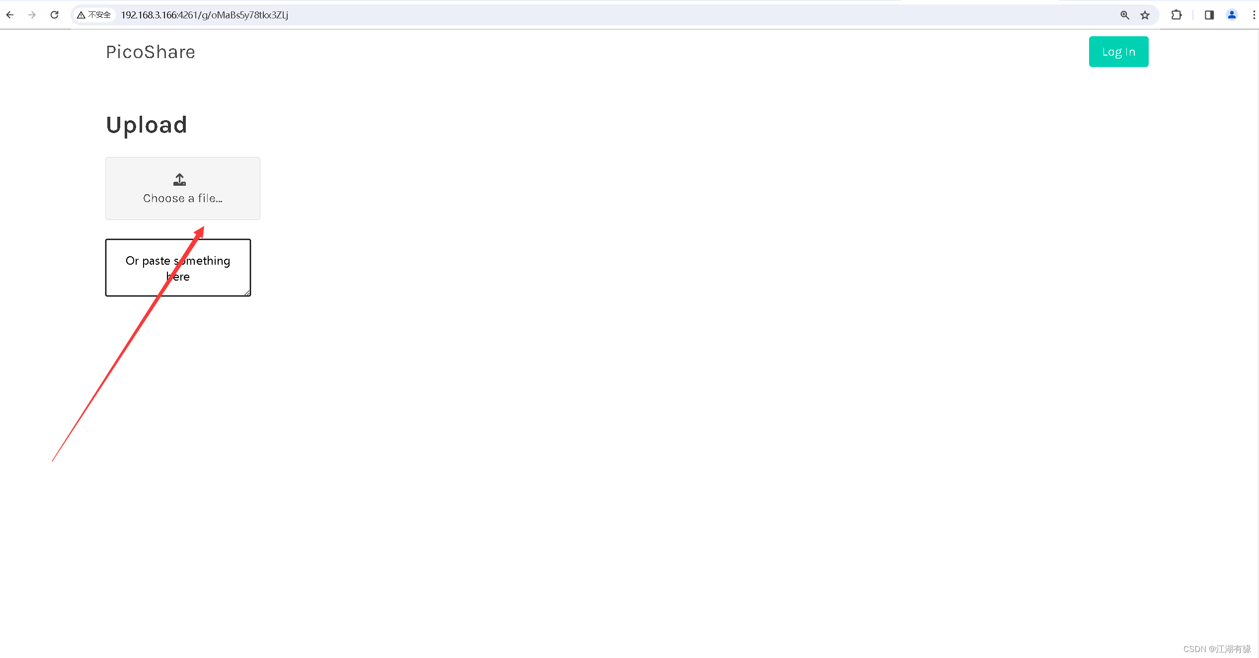 访问地址:http://192.168.3.166:3000,将IP替换为自己服务器IP地址,进入到PicoShare首页。如果无法访问,则检查服务器防火墙是否设置,云服务器的安全组端口是否放行等。点击右上角登录选项,进入PicoShare登录页。