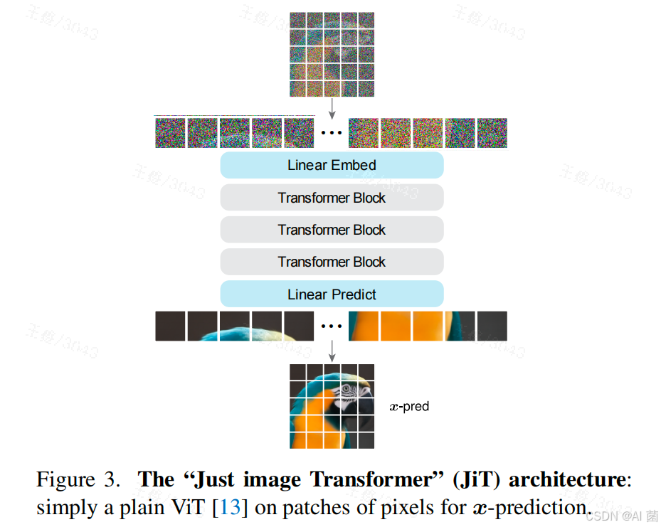 提出一种名为"Just Image Transformers(JiT)"的生成模型,核心是让神经网络直接预测干净图像(x-预测),而非噪声或含噪量。该模型基于纯视觉Transformer(ViT)架构,无需预训练、无额外损失函数、无tokenizer等辅助组件,通过大尺寸图像补丁(16×16、32×32等)直接处理像素数据,实现高维空间(256×256、512×512甚至1024×1024分辨率)的高效生成。