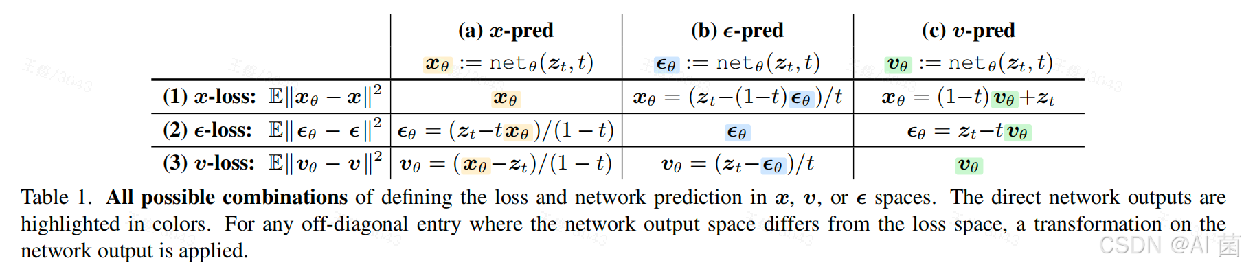 - 对比变量:预测目标(x-预测、ε-预测、v-预测)、损失函数(x-损失、ε-损失、v-损失)、是否使用预训练/额外损失/预处理器。