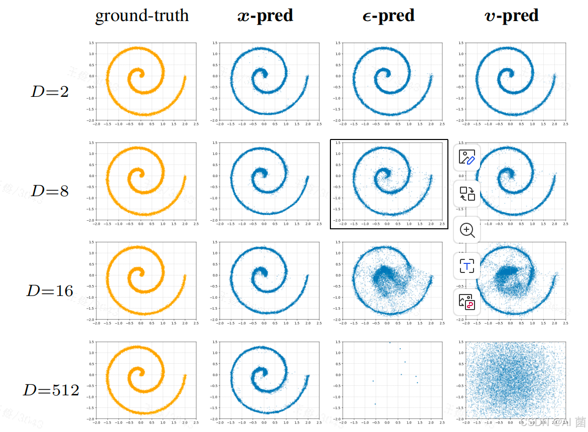 玩具实验(低维流形嵌入高维空间)表明,当观测维度D(如512)远大于数据固有维度d(如2)时,仅x-预测能稳定生成合理结果,而ε-预测、v-预测会因无法处理高维噪声信息而彻底失效,验证了流形假设下x-预测的本质优势。