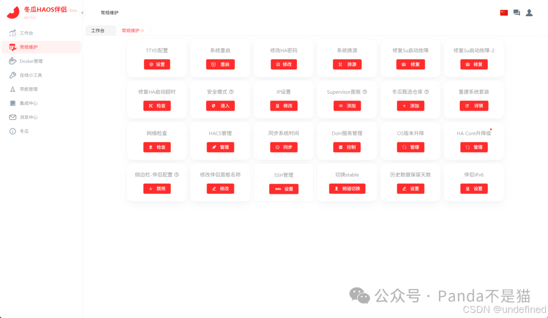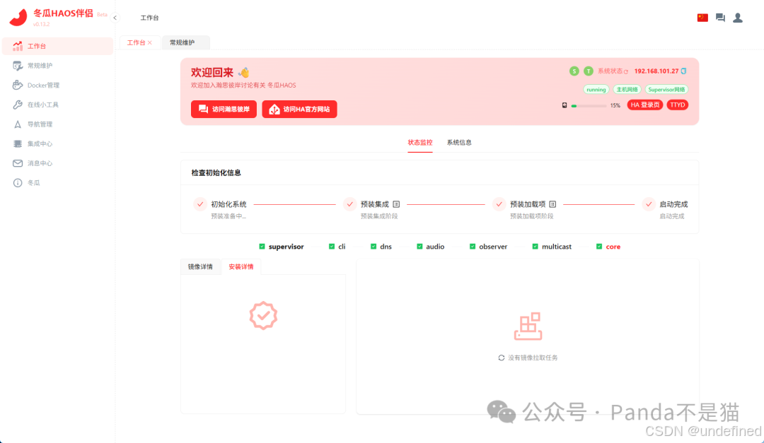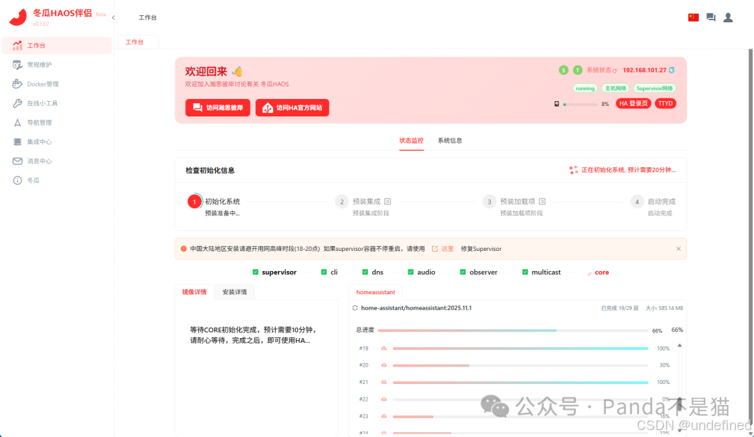 趁着系统在"自我组装"的这段空档,我们可以顺便参观一下冬瓜HAOS独有的管理后台。相比原生HA的简陋,这里集成了工作台、常规维护、Docker管理、在线工具 以及非常实用的集成中心。这些功能极大地降低了后期维护的难度,具体细节熊猫就不在这里做说明书式的讲解了,建议大家搭建好后亲自点进去探索。