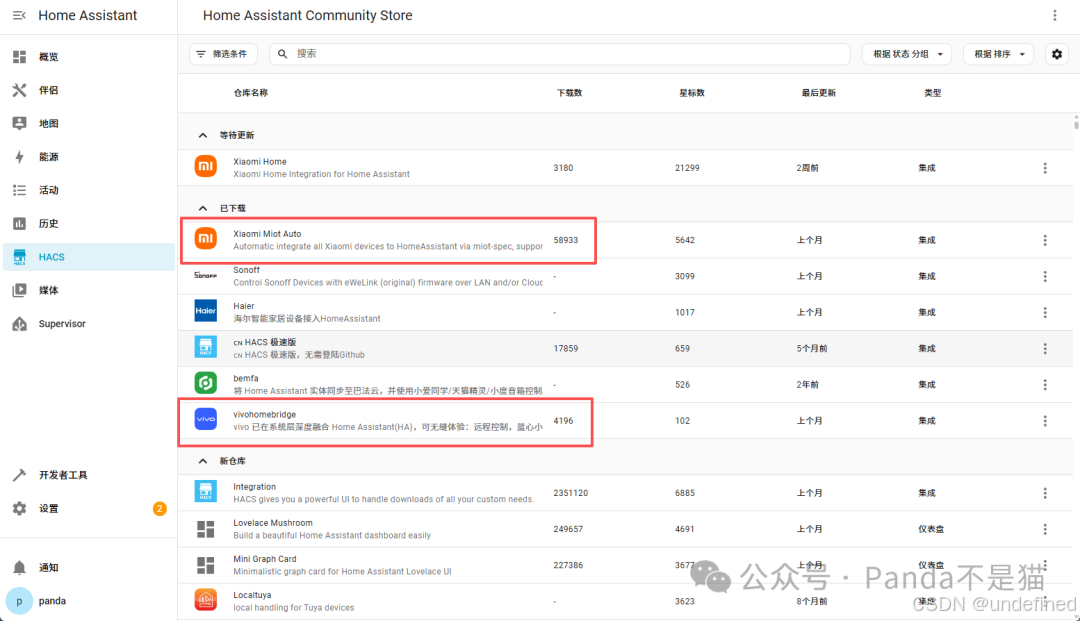 操作非常简单,通过浏览器访问IP:8123进入HA管理界面,点击侧边栏的HACS(第三方应用商店)。在这里搜索Vivo相关的集成组件并安装。