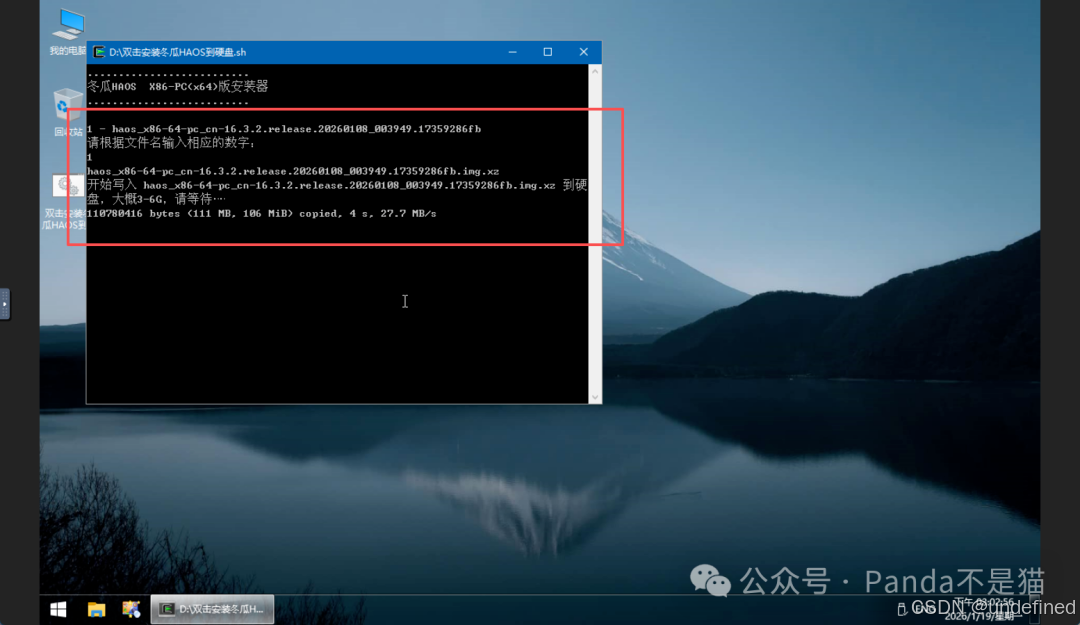 创建完成之后直接访问虚拟机,会通过VNC界面弹出Win10的桌面,在桌面有一个安装冬瓜HAOS到硬盘,点击即可。