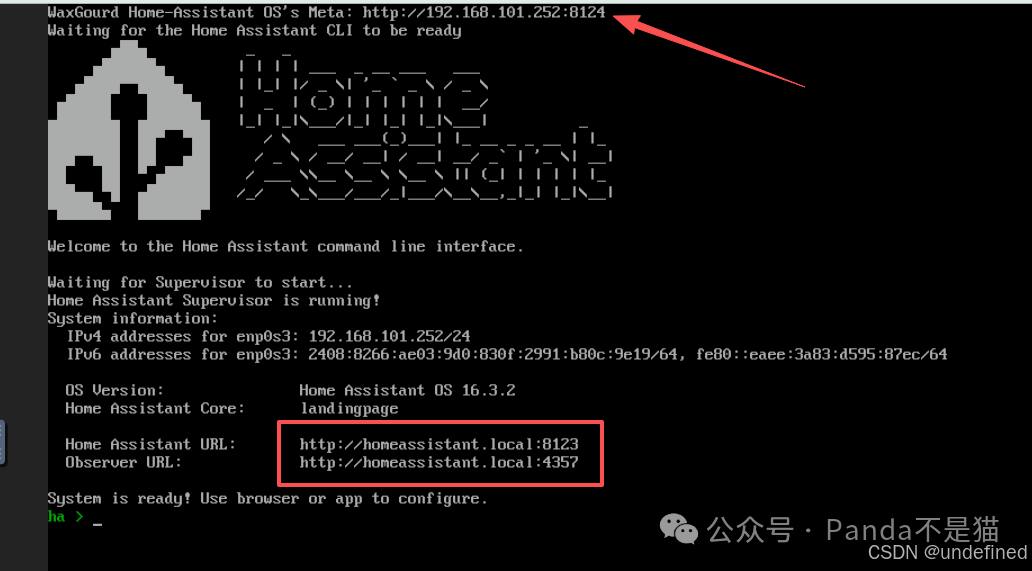 最后会出现这样的界面,这也就代表冬瓜HAOS已经安装成功了,在顶部能看到对应的IP与端口号,通过这个网址就能访问配置界面了。其中8124端口对应的为冬瓜HAOS系统,而8123则是HA的访问界面,也可以直接本地输入下方的网址访问。
