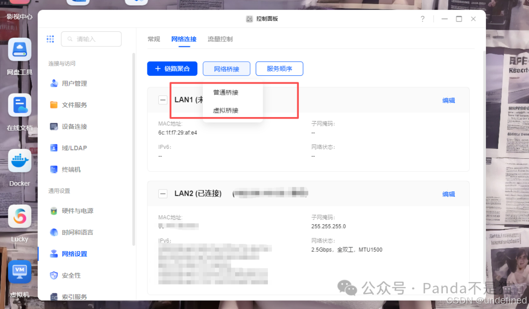 最后也既是最重要的网络,在网络设置前一定要检查绿联的网络模式为"桥接模式" (Bridge)。只有在桥接模式下,虚拟机的HA才能拥有一个和家里路由器同网段的独立IP地址(例如192.168.x.x),这是HA能够自动扫描并发现局域网内小米、HomeKit 设备的前提条件。