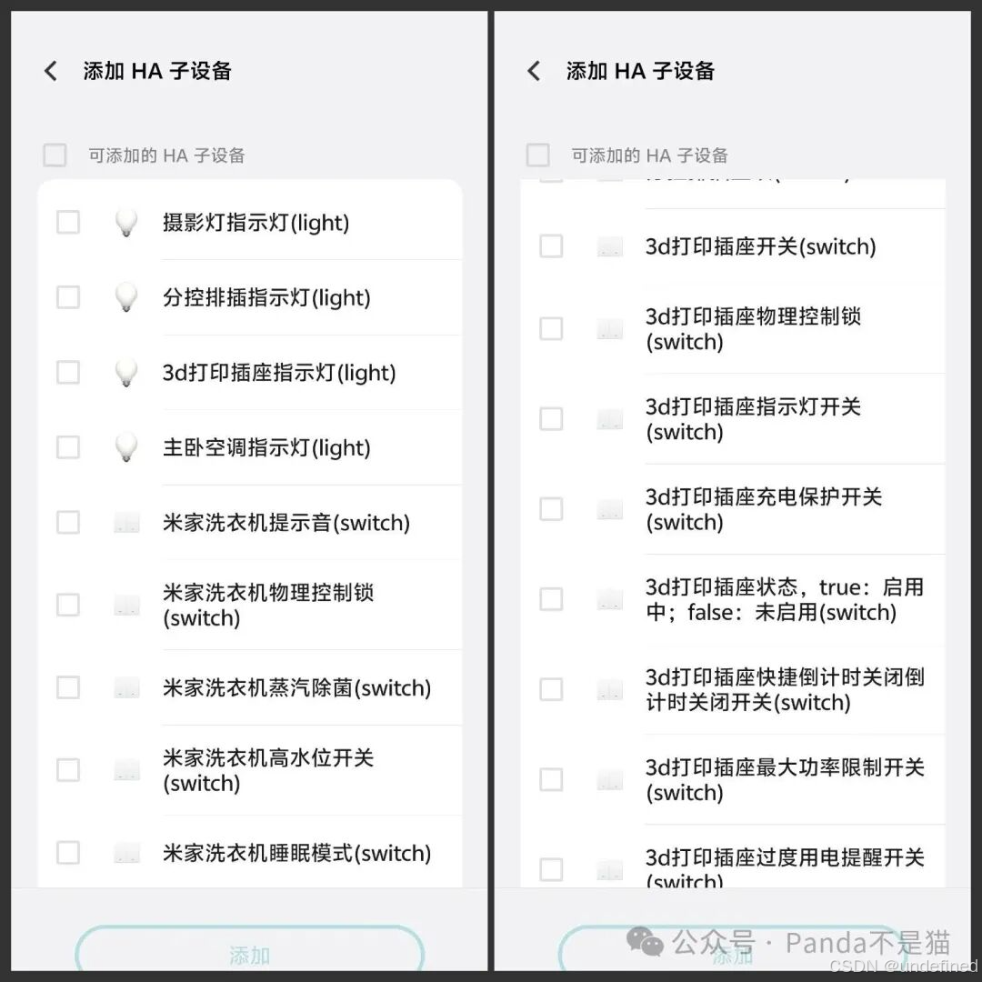成功登陆中控后,你通过"HA子设备"列表看到目前接入Home Assistant的所有智能家居(无论是小米的灯、还是苹果的插座)。你可以像点菜一样,选择性地将常用的设备勾选添加到VIVO的智慧生活APP中。