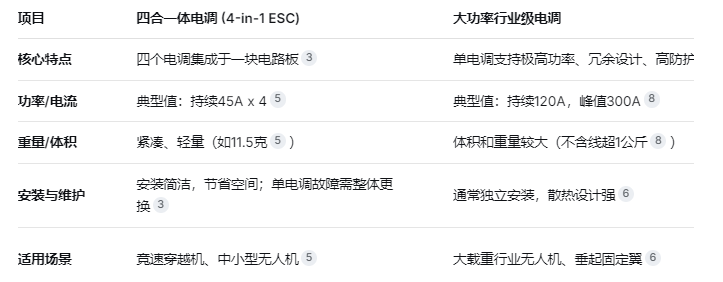 飞控的电调模块是无人机动力系统的核心,它负责接收飞控指令,精确控制电机转速。以下是不同类型电调的特点与选型对比,以及关键的选型参数。