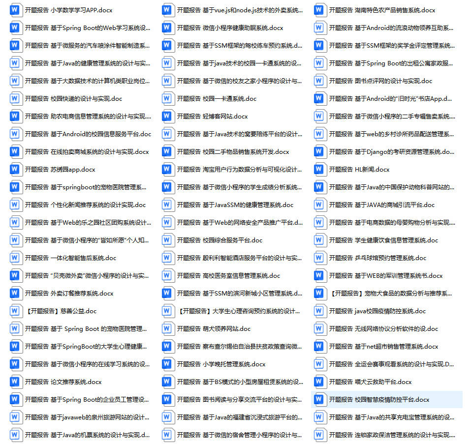 以上是某同学的毕业设计答辩的过程,如果你现在还没有参加答辩,还是开题阶段,已经选好了题目不知道怎么写开题报告,可以下面找找有没有自己符合自己题目的开题报告内容,列表中的开题报告都是往届真实的开题报告,可发送使用或参考。文末或底部来联xi可免费获取