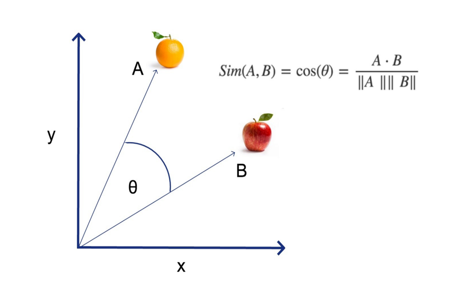其中,余弦相似度 cosθ 的 θ 为两向量间夹角,值∈[0,1],越接近 1 则越相似。