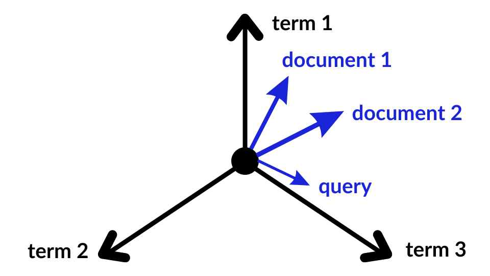 向量空间模型(Vector Space Model,VSM)是一种经典的 NLP 文本表示方法,其核心思想就是将文本转化为高维向量空间中的向量,继而通过比较向量之间的相似度来评估文本之间相关性。这些文本的类型包括:字、词、短语、句子、段落、整个文档、Query 查询等等。如下图所示,doc1、doc2 和 query 之间的距离表示了它们之间的相关程度。