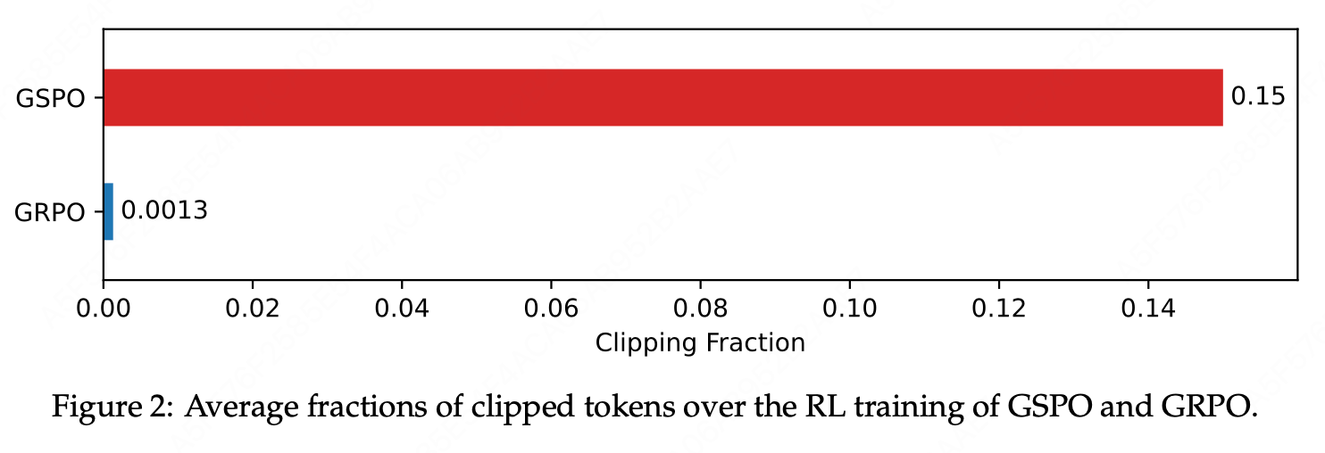 - 观察到 GSPO 和 GRPO 之间的裁剪比例存在两个数量级的差异,尽管 GSPO 裁剪了更多的 token,但仍然实现了比 GRPO 更高的训练效率。