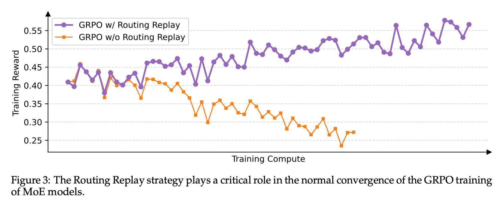 为了确保 GRPO 等算法在混合专家(MoE)模型中能够稳定运行,研究者采用了 Routing Replay(路由回放)训练策略。