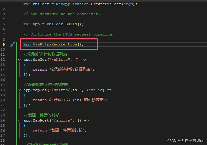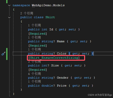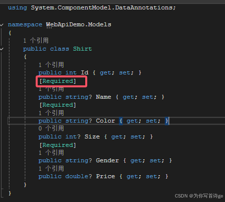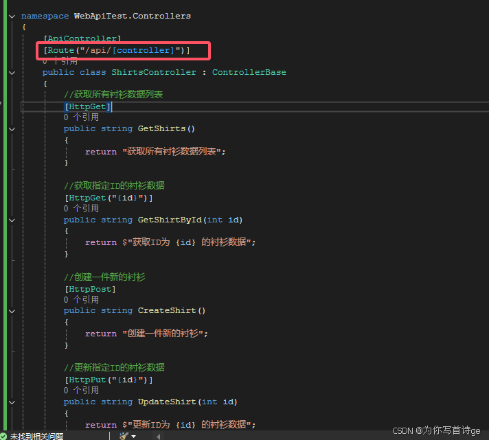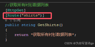 使用注解[Route("/shirts")]设置Web API的URL,可以在方法前使用,也可以在类前使用