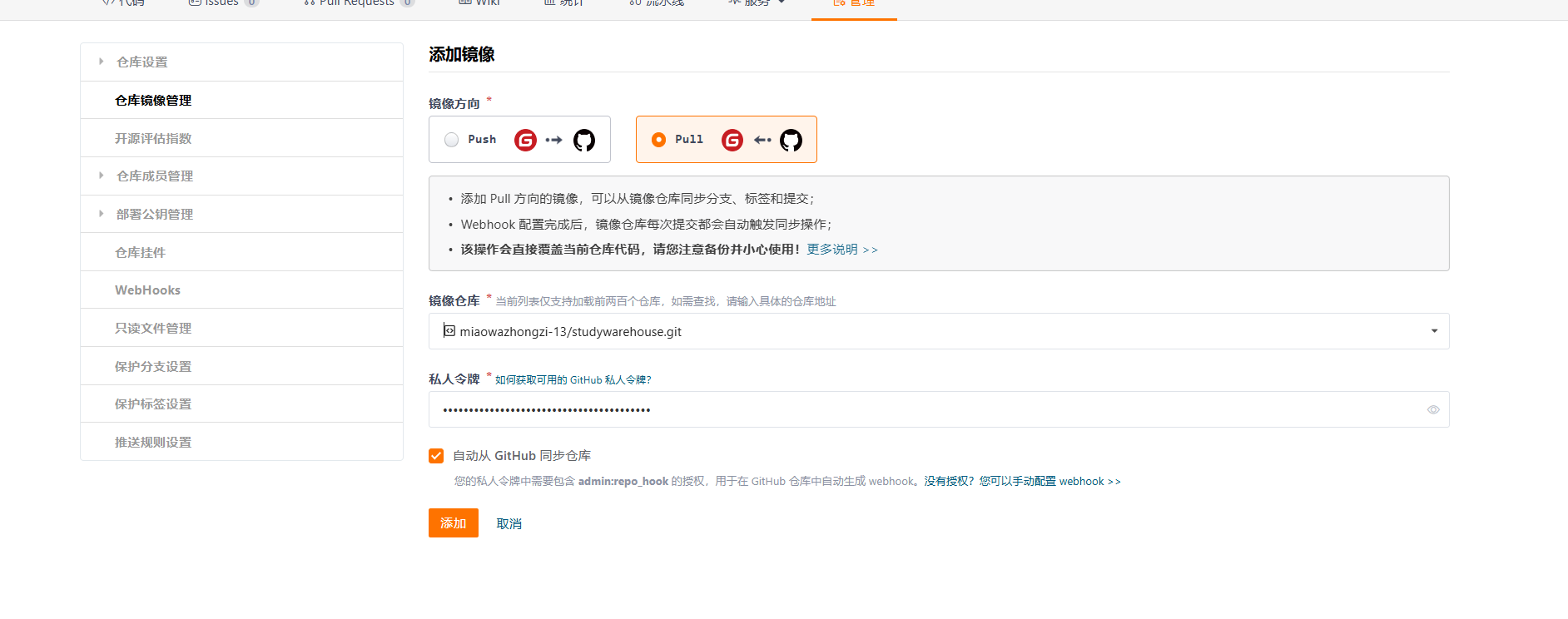 2.gitee仓库中配置镜像