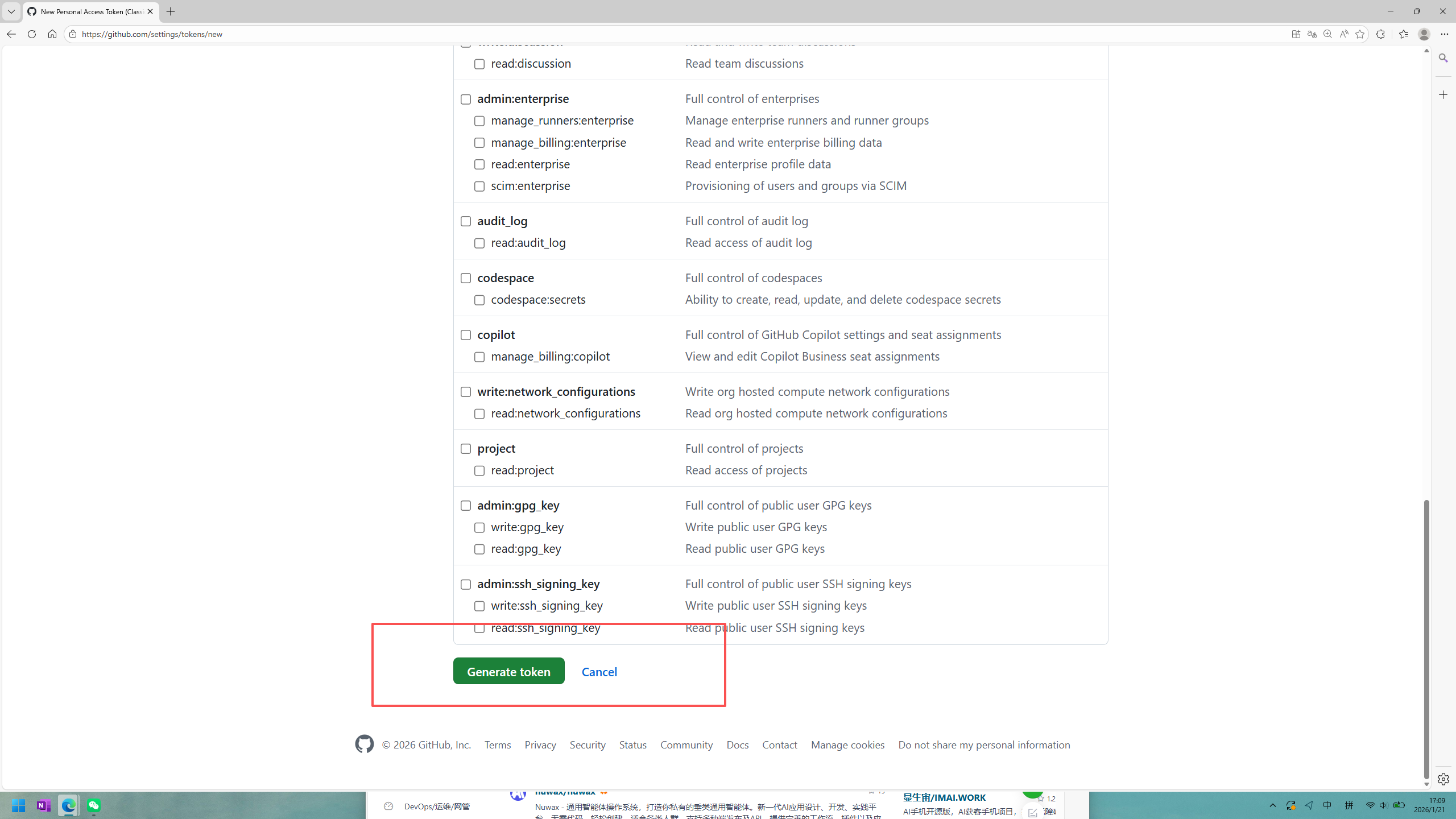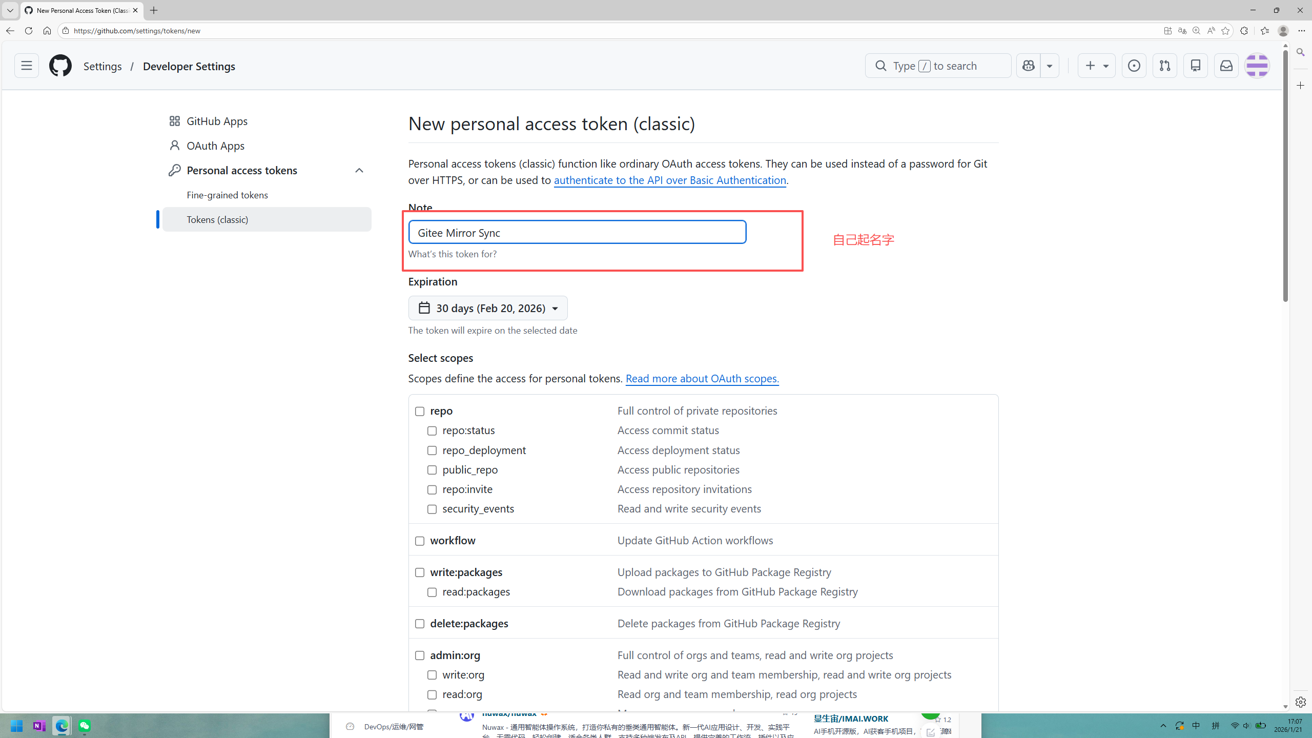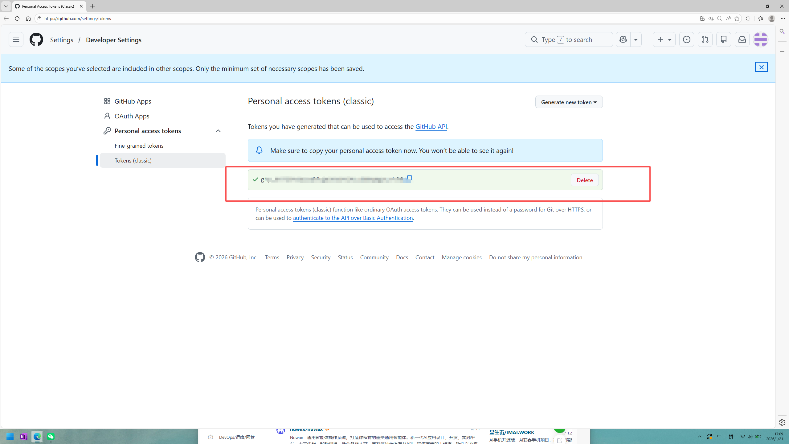 生成对应的令牌后要妥善保存 只会显示一次