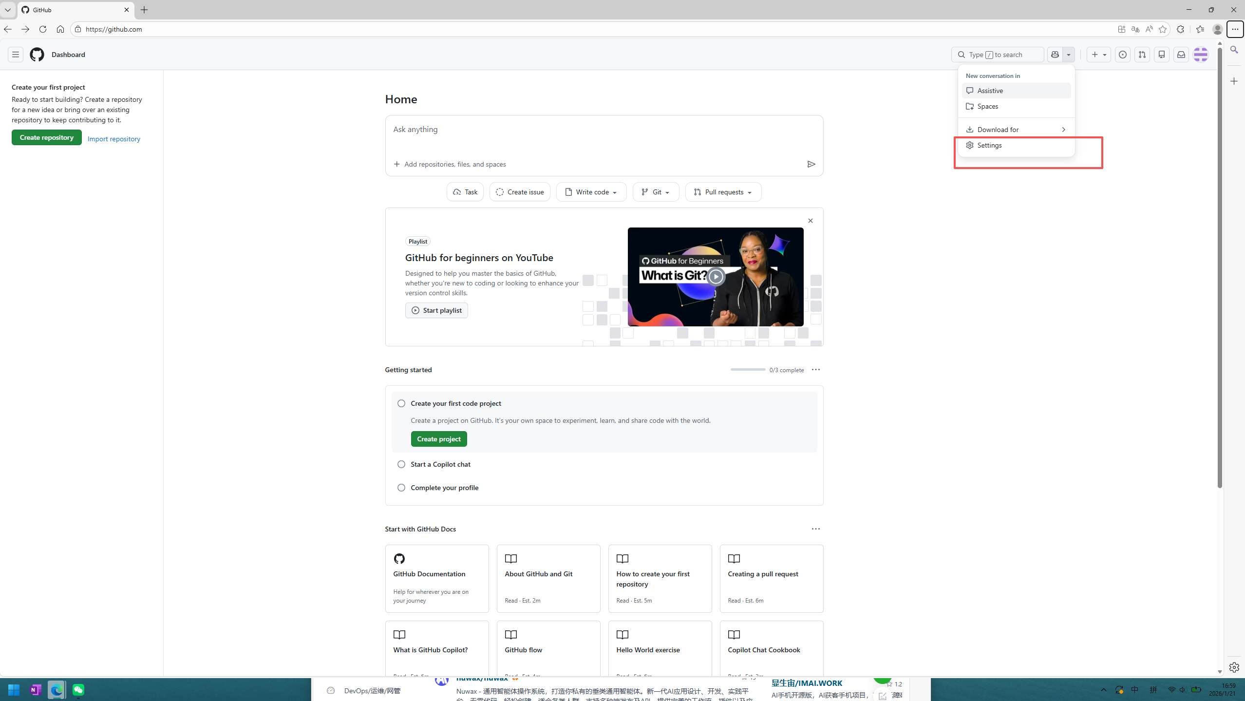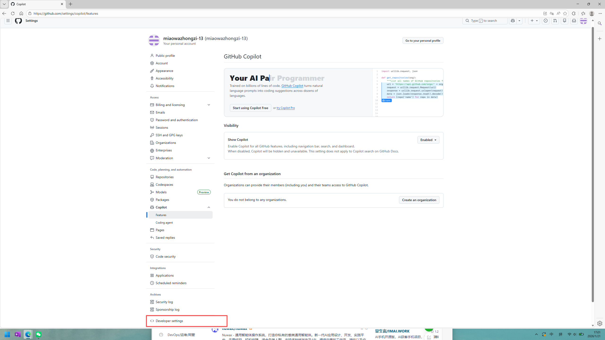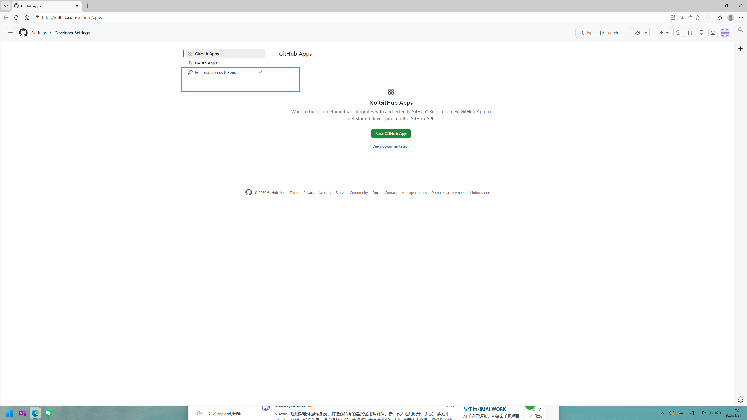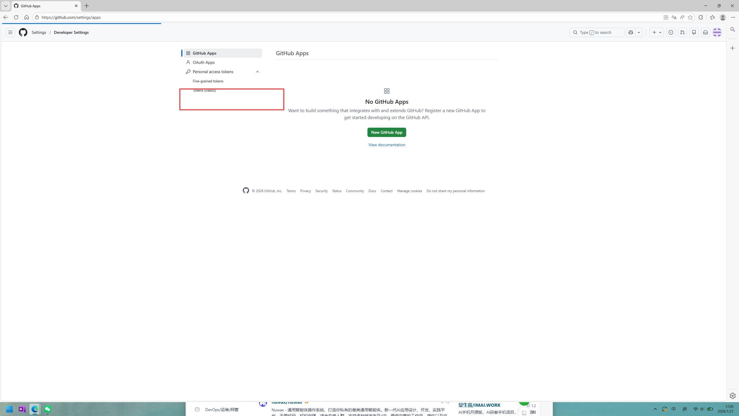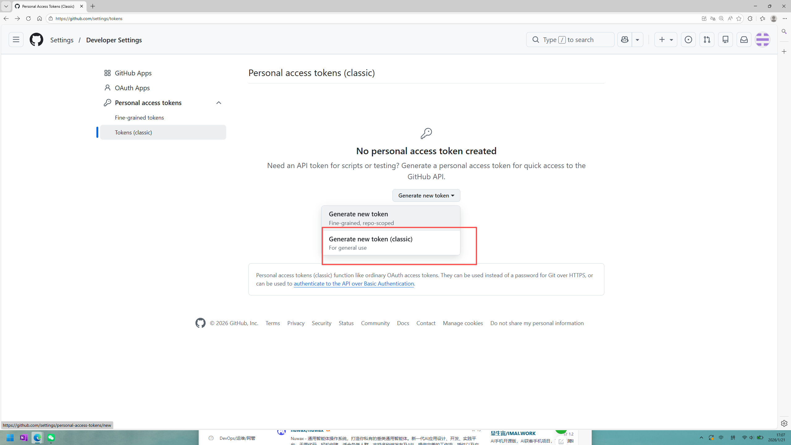 找到github设置->setting->developing settings