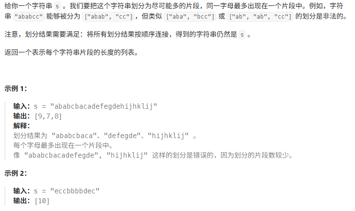 题目要求对字符串进行分割,使得每个字母最多只出现在一个分割片段中 。
