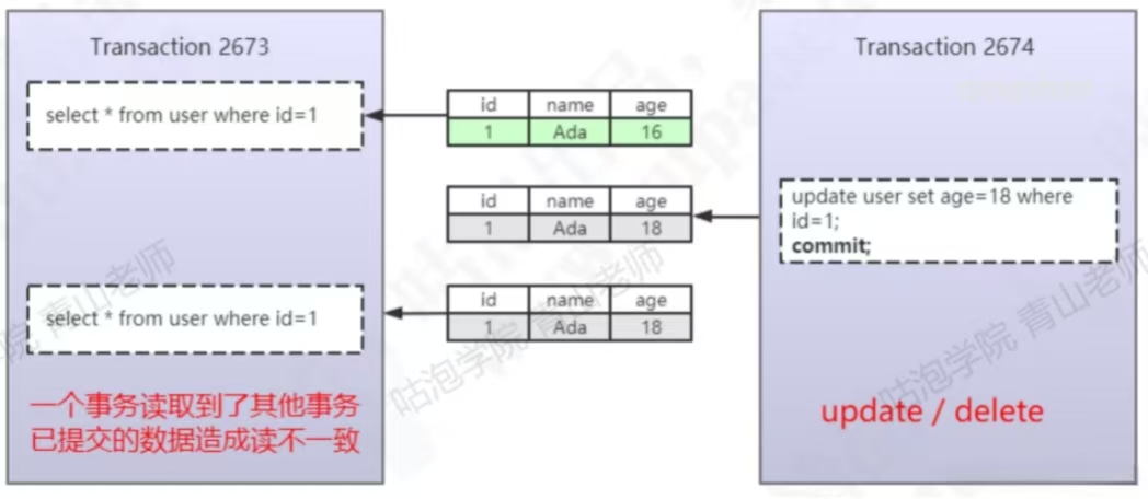 第一个事务,读到了其他事务已提交的数据,导致前后两次读取数据内容不一致的情况。