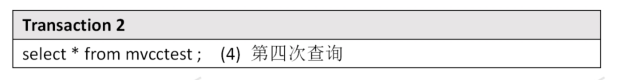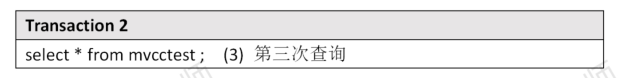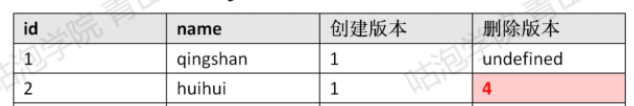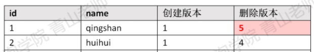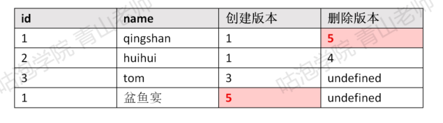 MVCC査找规则:只能査找创建时间小于等于当前事务ID的数据、和删除时间大于当前事务ID的行(或未删除)。"盆鱼宴"创建版本大于2、查不出来,"qingshan"删除版本大于2,可以查出来。