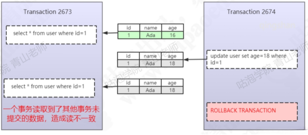 - Read Uncommitted (未提交读) 一个事务可以读取到其他事务未提交的数据。会出现脏读,没有解决任何问题。