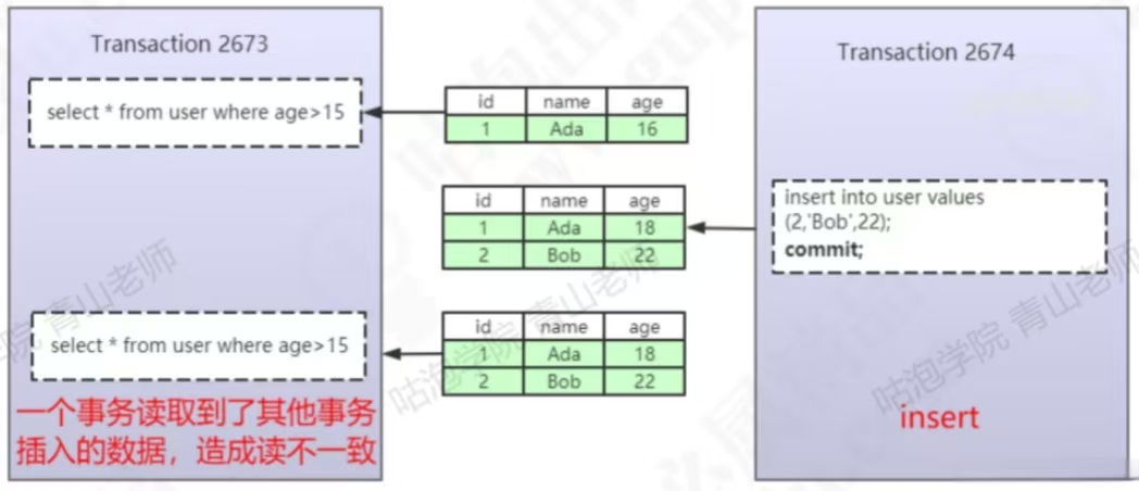 第一个事务,读到了其他事务已提交的数据,导致前后两次读取数据数量不一致的情况。