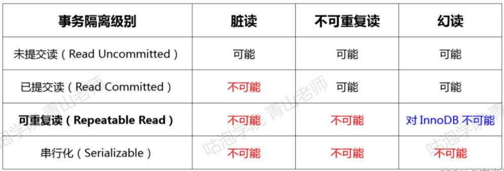 - Serializable (串行化) 在这个隔离级别里面,所有的事务都是串行执行的,对数据的操作需要排队,不存在事务的并发操作。解决了所有(脏读、不可重复读、幻读)问题。