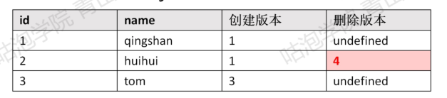 此时 id = 2 的这条记录,删除版本被记录为当前事务ID:4,其他数据不变