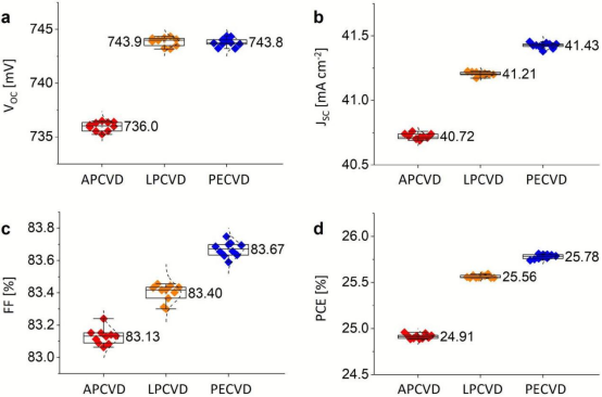 不同CVD方法钝化的 TOPCon 太阳能电池性能参数对比:(a) 开路电压 (Vₒc); (b) 短路电流密度 (Jₛc); (c) 填充因子 (FF); (d) 功率转换效率 (PCE)