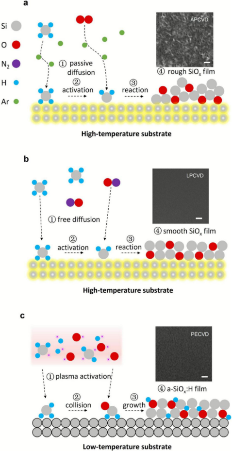 (a) APCVD; (b) LPCVD; (c) PECVD 三种方法沉积SiO₂的示意图与表面形貌