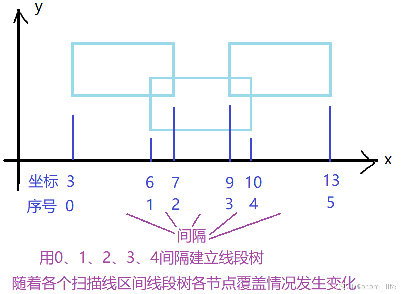 线段树的核心作用:随着扫描线从下到上遍历,高效维护当前 y 轴位置的「有效宽度」(被矩形覆盖的 x 轴总长);