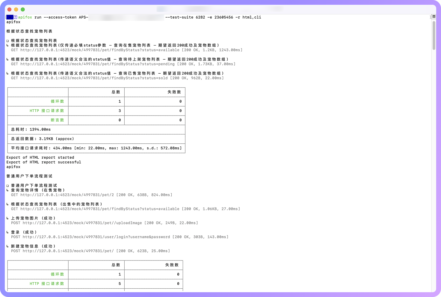 运行结束后,它还会在当前目录下生成一个 apifox-reports/ 文件夹,里面包含了 HTML 格式的详细测试报告。
