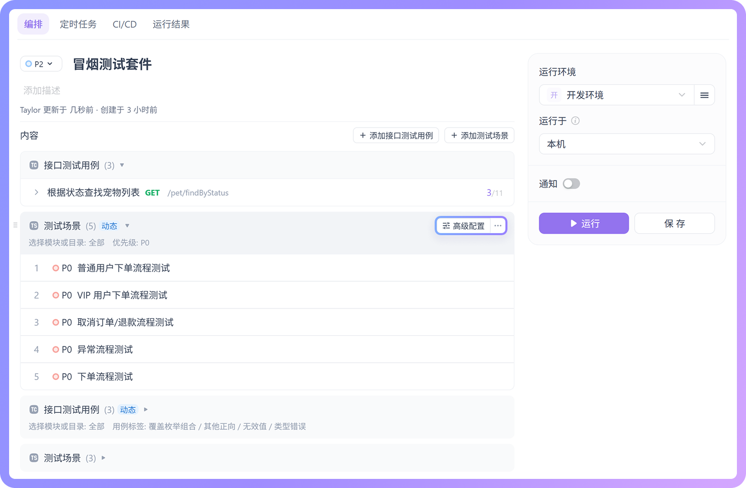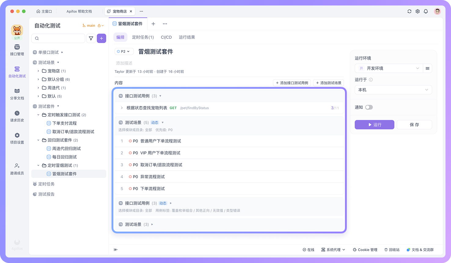 Apifox「测试套件」通过动态模式解决了这个问题。它不再死板地记录 ID,而是保存一套筛选规则,例如按目录、标签、优先级等条件进行组合筛选。