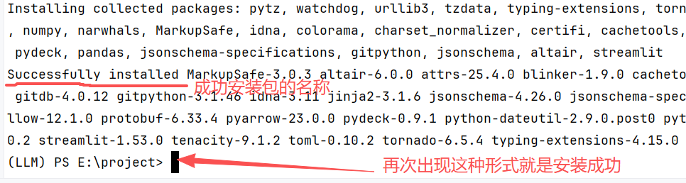 打开PyCharm底部的Terminal终端,执行命令 pip install streamlit ollama**-i https://pypi.tuna.tsinghua.edu.cn/simple(加粗的是镜像源,加快下载速度,也可以不加)**,安装完成后可通过以下命令验证ollama。