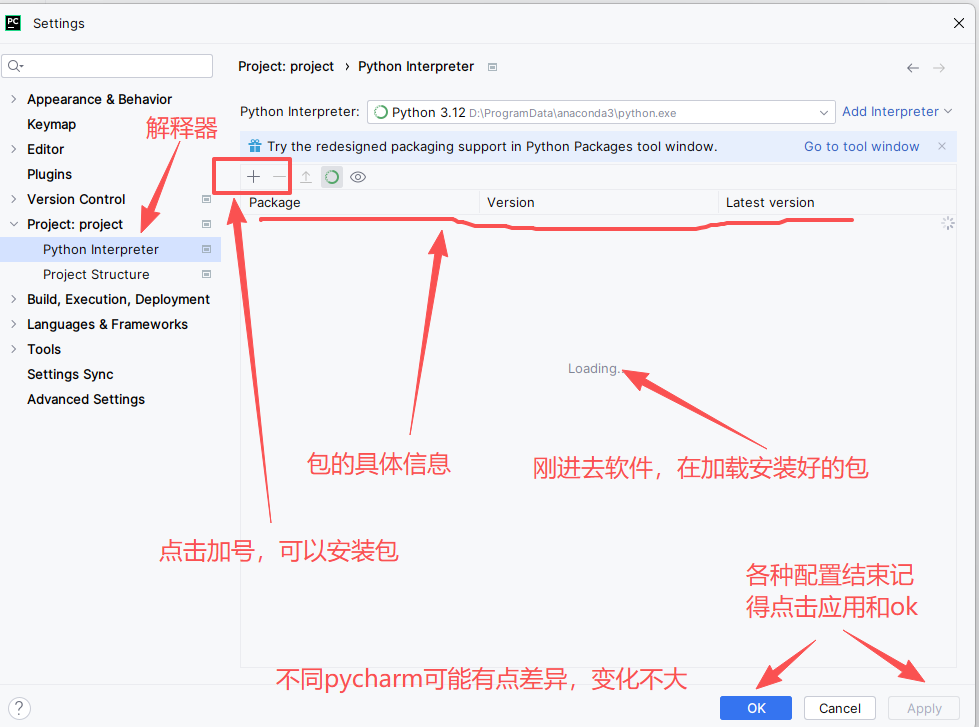 打开PyCharm项目,依次进入File(右上角)→ Settings → Project: 项目名 → Python Interpreter」,点击右侧「+」号,在搜索框分别输入streamlit、ollama,选中对应结果后点击「Install Package」,等待安装完成即可。