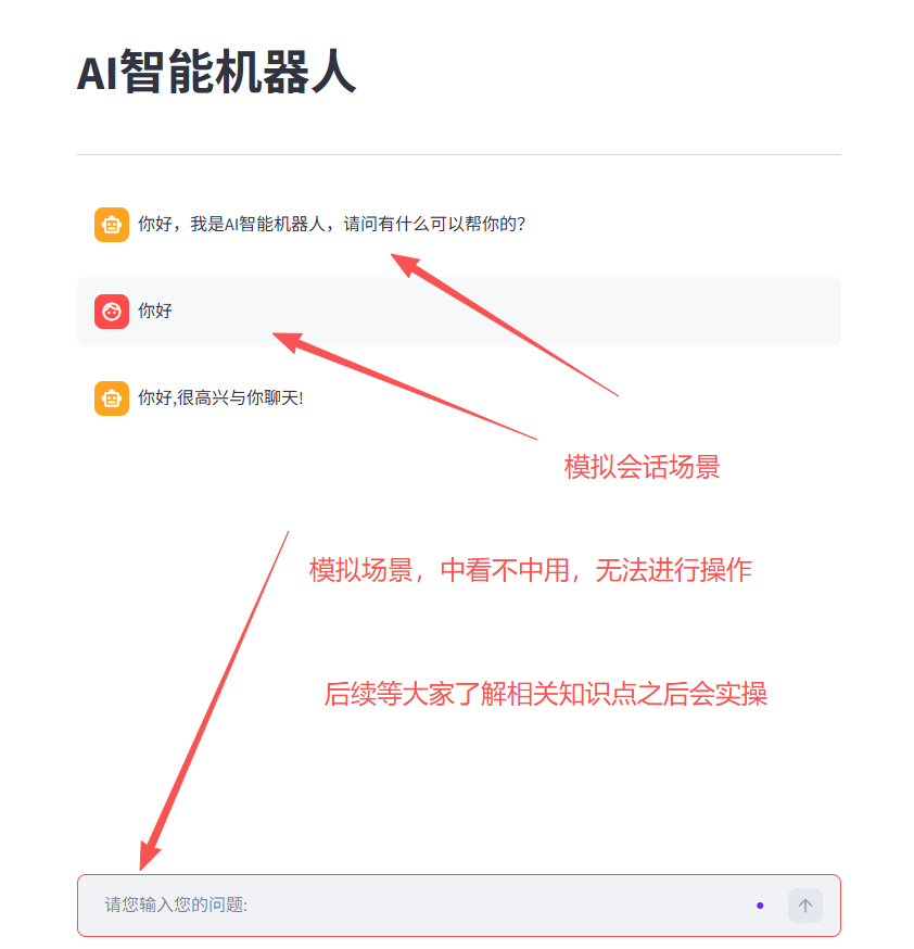 注意:为了简化操作,因为好多知识点还没分享,下面的内容只是模拟AI和用户的会话,后面会系统性的分享具体的大模型部署操作。