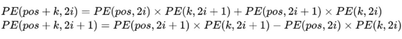 可以看出,对于 pos + k 位置的位置向量某一维 2i 或 2i + 1 而言,可以表示为 pos 位置与 k 位置的位置向量的 2i 与 2i + 1 维的线性组合,在线性组合中蕴含着相对位置信息。