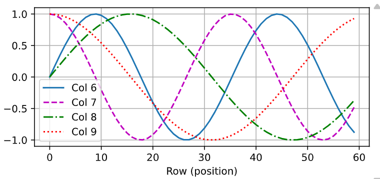 可以看到位置嵌入矩阵第6列与第7列的频率高于第8列和第9列;第6列与第7列之间的偏移,第8列和第9列之间的偏移是因为正弦函数和余弦函数的交替。